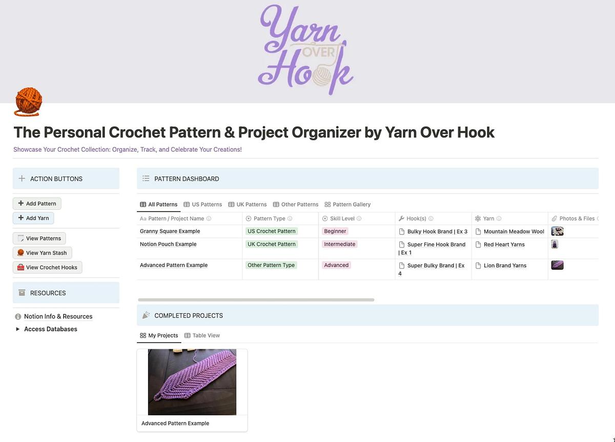 The Personal Crochet Pattern & Project Organizer for Notion will help you take control of your crochet world! Easily catalog your yarn stash, hooks, patterns, and finished projects, all in one beautifully designed, easy-to-use dashboard.